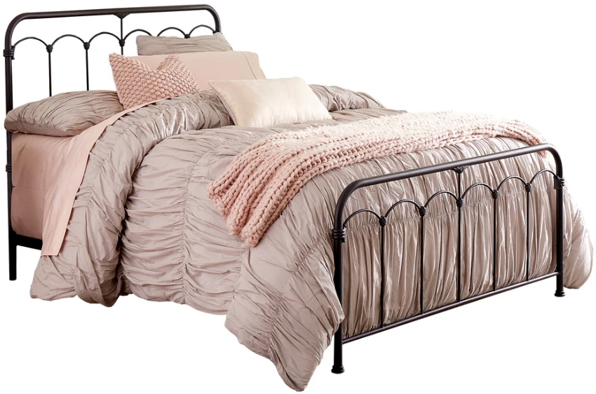 Simple and romantic. The Hillsdale Furniture Jocelyn King Bed boasts a traditional silhouette with a playful Black Speckle metal finish. Its delicate spindles culminate in gentle arches with clamshell castings between each arch that correspond splendidly with the whimsical rail connectors.Read More