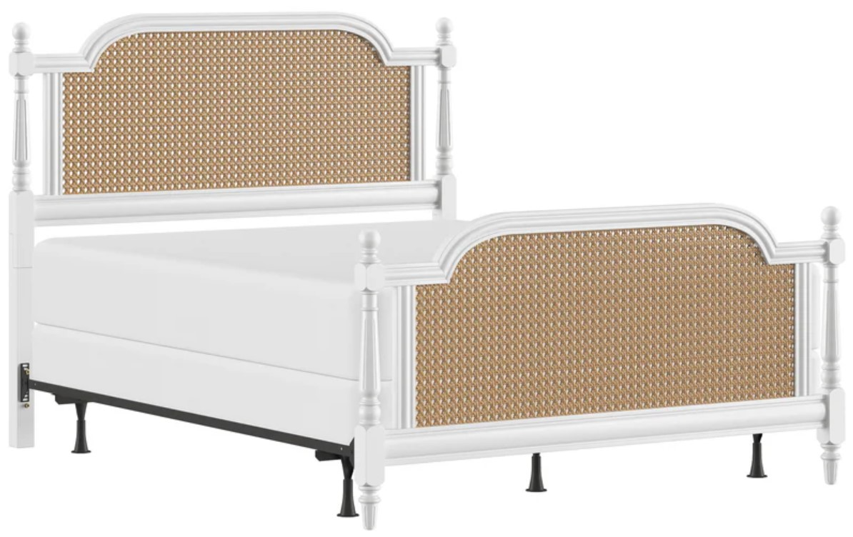 This elegantly contoured queen bed without frame is the epitome of coastal farmhouse chic. Reminiscent of the French countryside, this bed boasts a gracefully arching headboard and footboard, embellished finials which sit atop turned legs and inset natural cane panels.Read More
