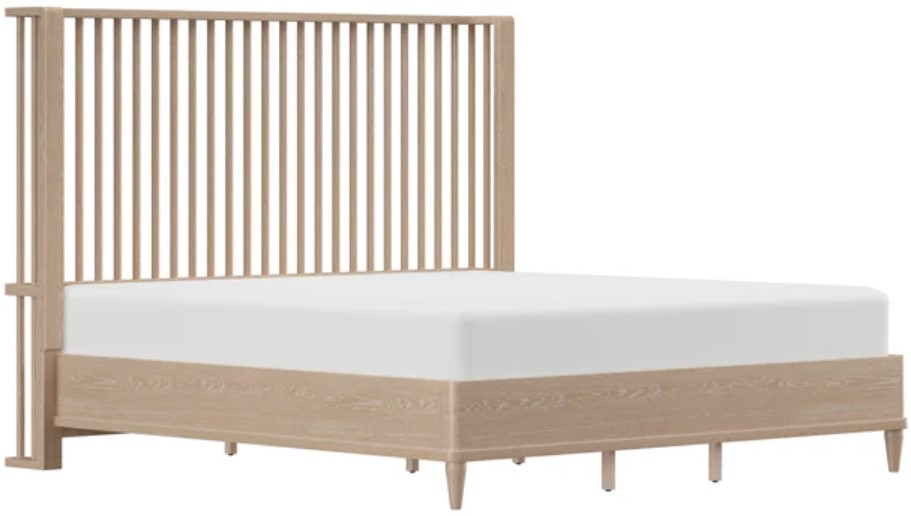 Coastal farmhouse king platform bed boasts a statement spindle headboard