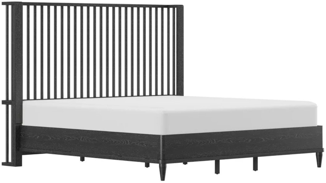 Coastal farmhouse king platform bed boasts a statement spindle headboard